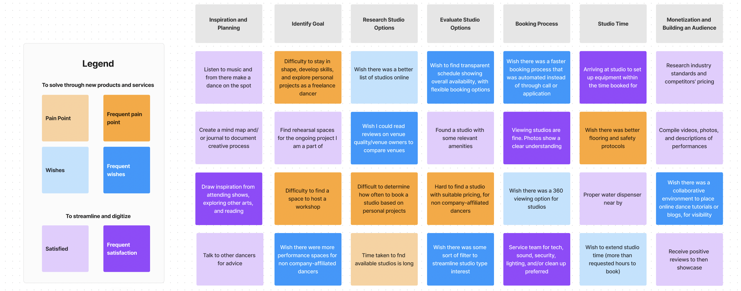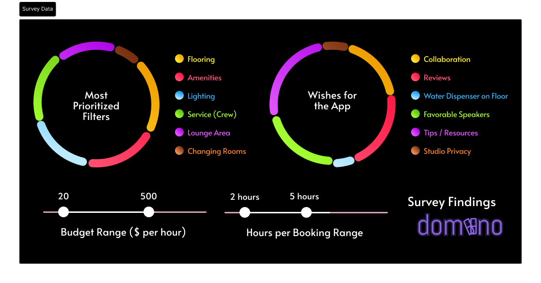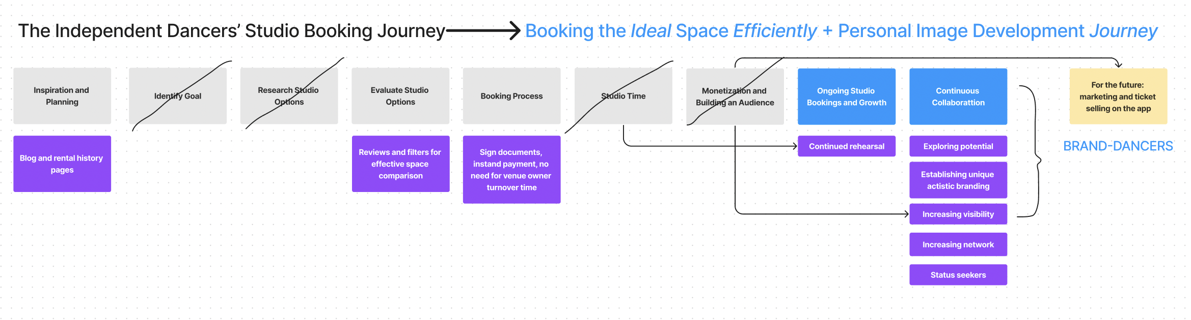 One of the biggest takeaways from this exploratory research was that there was a difference between a “Dancer’s Space Booking Journey” and a “Dancer’s Brand Building Journey.” Rehearsing, performing, and hosting classes is not just an activity or a hobby, but a potential to boost the career for many of the independent dancers. I had only thought of a dancer journey as a space booking process to gain money from activities hosted in the venue, or work on their craft to stay in shape. I then realized that what I needed to explore further was the dancers’ brand-building journey. From this research, I modified the initial specific stages of a dancer booking a space to work in, to create the solution for 1. the process to be more efficient and suitable for their needs and 2. to include a networking and collaboration piece that is just as important as working on a personal dance piece. As my proposed space rental app for dancers, Domino, expands and becomes more than just an amateur space-booking app (of which already over-saturates the market). Domino is also a patform to expand creative knowledge with well established expertise in the creative field.