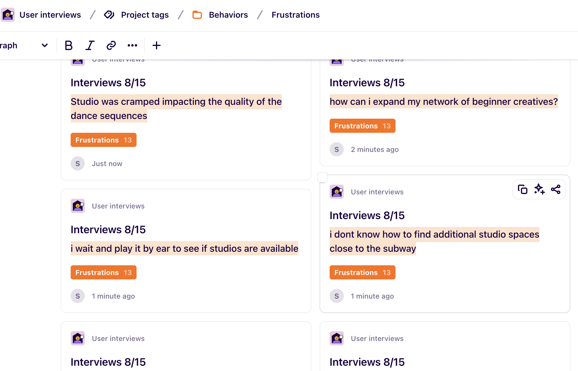 My qualitative research findings (taken in an Empathy Map format to ensure “why” questions asked to generate answers from all 4 dimensions) were transcribed, coded, and organized on dovetail in order to be able to analyze the data collaboratively with teammates, and use it as a knowledge repository.
